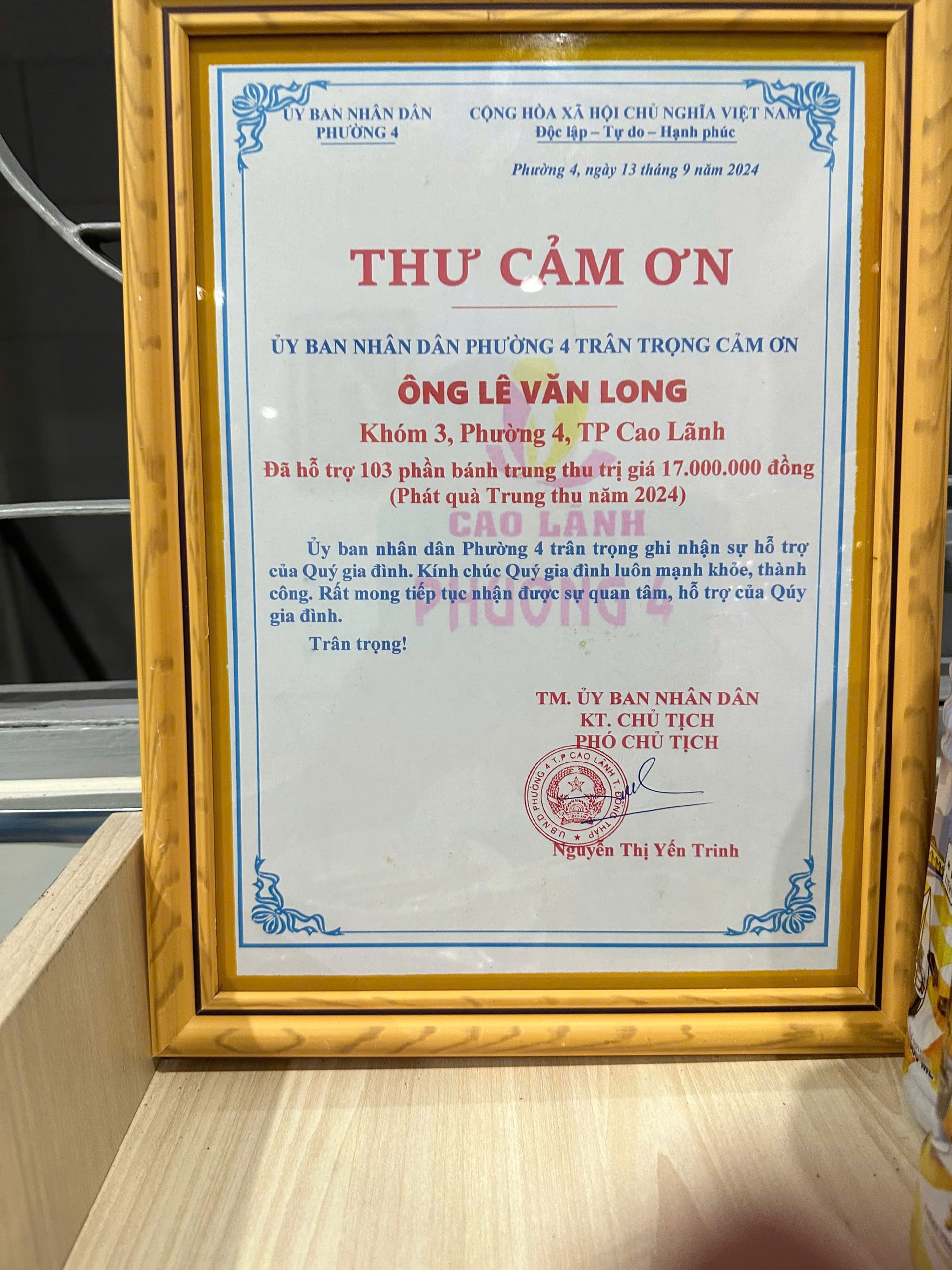 Nhân dịp này, UBND Phường 4 đã tặng 81 phần quà (200.000đ/phần) gồm bánh trung thu và lồng đèn cho trẻ em thuộc hộ nghèo, hộ cận nghèo, khuyết tật, con lực lượng, con công đoàn viên, với tổng trị giá 16.200.000 đồng.